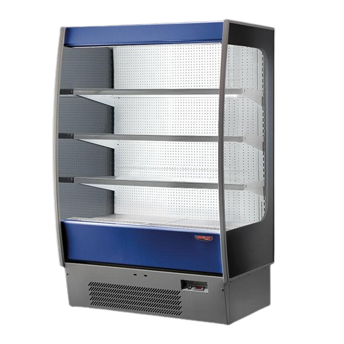 3 shelves in non-toxic white painted sheet metal or in stainless steel (for stainless steel version), adjustable in height, equipped with price holder and tempered glass air deflector.
