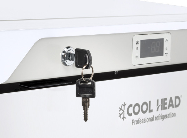 200 liters ABS freezer cabinet in white color and internally thermoformed, fitted with a digital thermostat, reversible door, lock and main switch, handle along door profile, 2 fixed evaporator shelves + removable shelf in the middle, assembled 2 adjustable feet + 2 rollers at the back.
