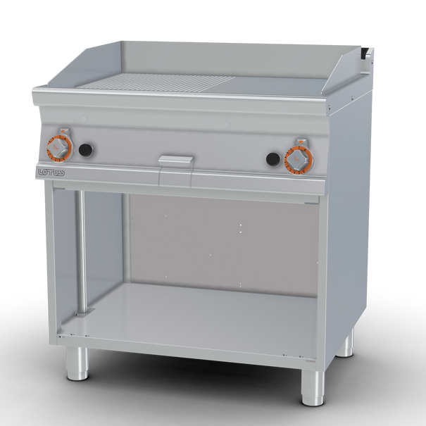 5. Professional Gas 1/2 Grooved + 1/2 Smooth Chromed Griddle Superchrome (MOCA APPROVED) on open cabinet (FTLR-78GS).