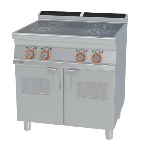 Ceramic glass top with 4 high output cooking areas, heats only the content of the pan with magnetic steel base.
