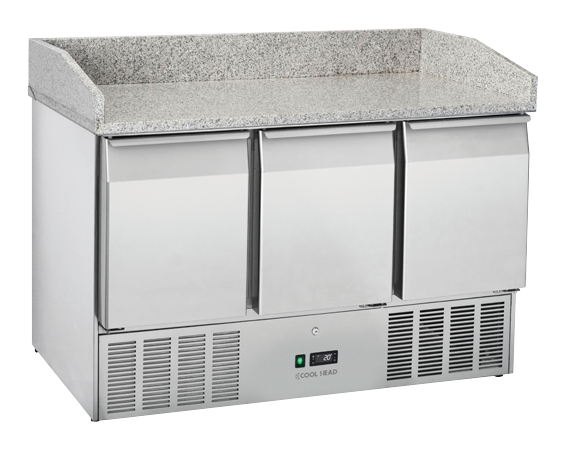 Clean and essential appearance, this pizza model with granite top is perfect to save space and offer a refrigerated workstation in any professional kitchen. The CRM 93A is a perfect example of efficiency, three doors, an adjustable shelf GN1/1 for each door, a digital thermostat, an engine room at the bottom, an easily removable condenser filter for smooth maintenance and cleaning and a sliding engine which is easy to pull out for manageable after-sales servicing. The item is suitable for refrigerated topping unit, available with flat glass top or stainless-steel lid top, in order to preserve the freshness of the ingredients.