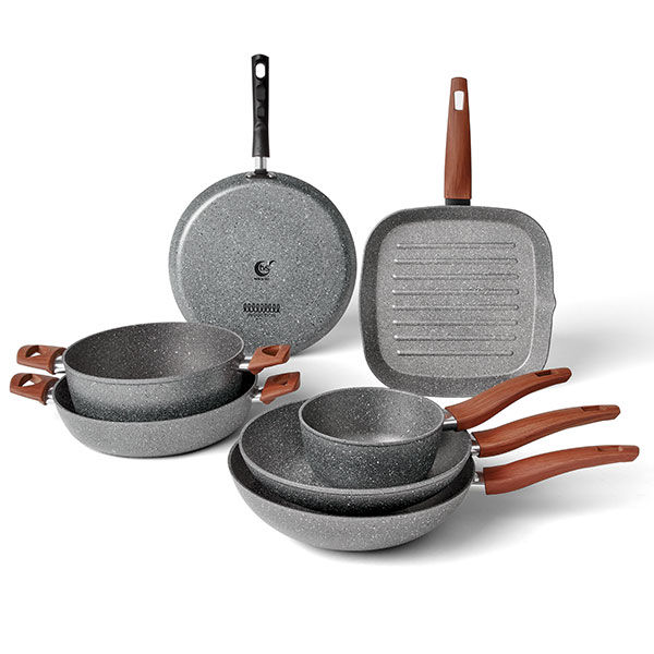 Cookware pans, pots, frypans, saucepans, and casseroles.
